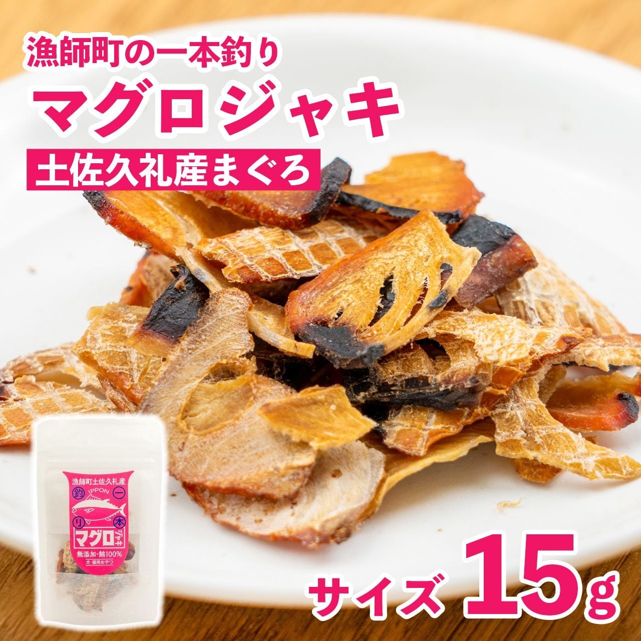 高知県・中土佐町久礼の贅沢な「一本釣りマグロジャキ」です。新鮮なマグロを一つひとつ丁寧に加工し、保存料や着色料は一切使用しない無添加製法で仕上げました。マグロ本来の旨みと風味がギュッと詰まった一品は、愛するワンちゃん、猫ちゃんたちの特別なおやつにぴったりです。